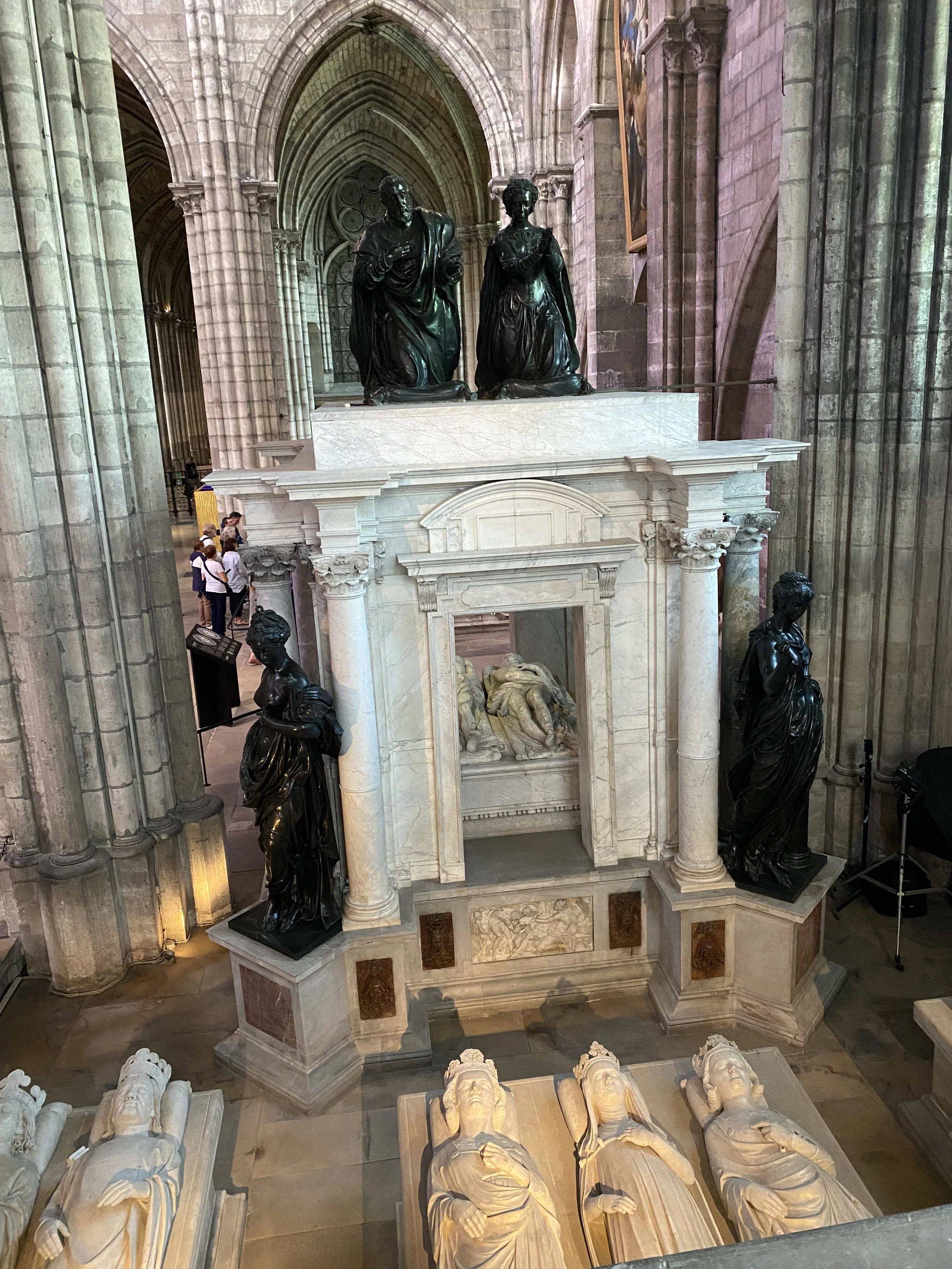 Autre must, le tombeau d’Henri II et de Catherine de Médicis, terminé en 1573, en marbre de différentes couleurs, comme un temple antique, entouré de quatre grandes vertus de bronze : la justice, la prudence, la force et la tempérance, quatre qualités nécessaires au roi pour bien gouverner.