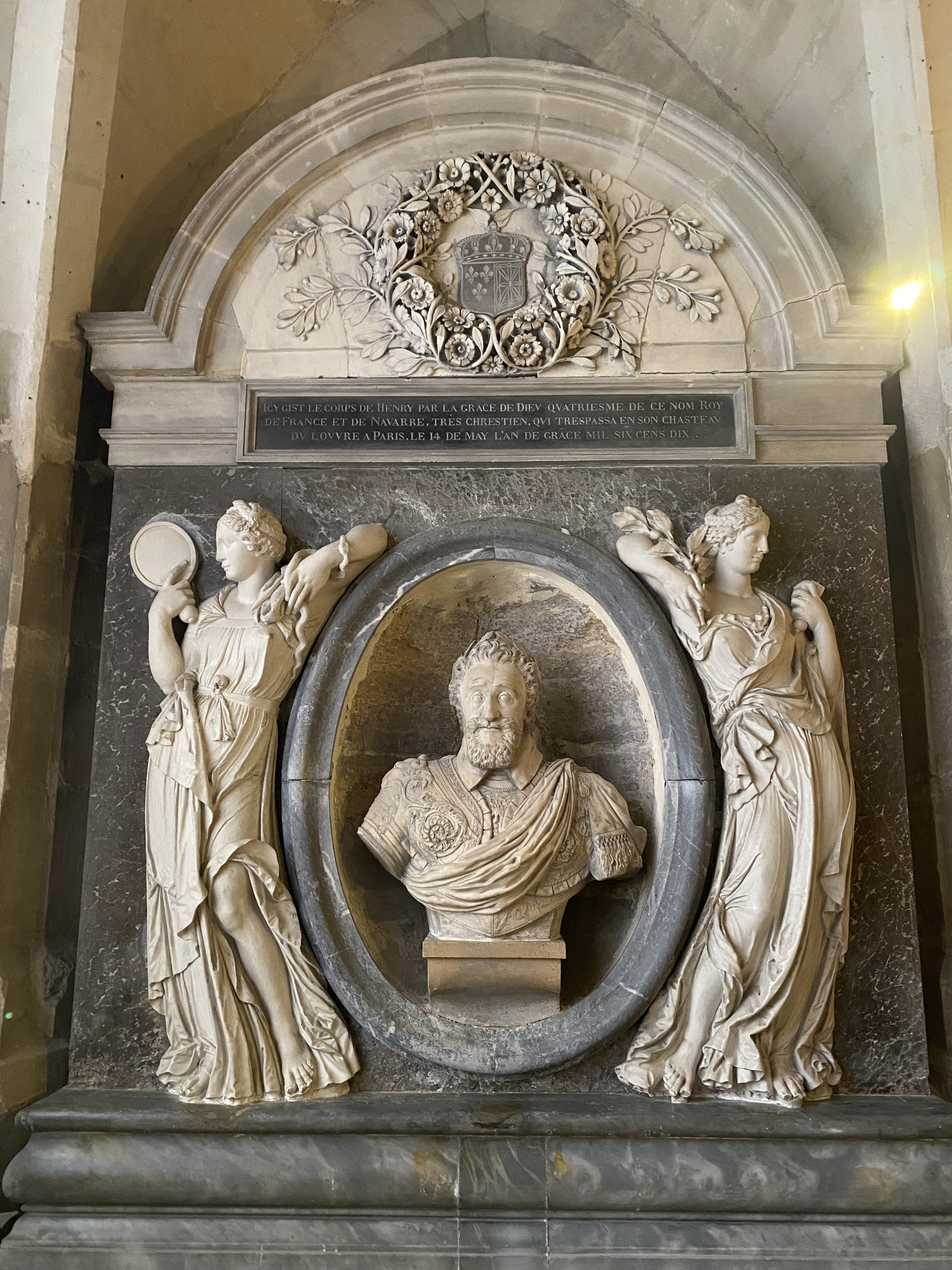 Les tombes royales ont été profanées en août puis en octobre 1793 par les révolutionnaires, afin de récupérer le plomb des cercueils (nécessaire à la fabrication de canons et de balles) et détruire tout symbole de la royauté. Dans le caveau des Bourbons, on exhibe le corps d’Henri IV (cénotaphe ci-dessus), et comme il est bien conservé, on aurait peut-être fait un moulage de son visage. Puis c’est au tour de Marie de Médicis, de Louis XIII (reconnu grâce à sa moustache), et de Louis XIV (dont le corps était entièrement noir comme de l’encre, selon les rapports). Certains corps sont en putréfaction, ou liquéfiés, ou réduits en poussière (comme celui de Louis XV, mort de la variole, et que l’on n’avait pas embaumé), d’autres sont bien conservés. L’odeur est atroce. En public, on balance les dépouilles dans une fosse commune à proximité. Les amateurs de souvenirs, désireux de conserver ou vendre des reliques royales, repartent avec une dent, un ongle, une touffe de cheveux…
