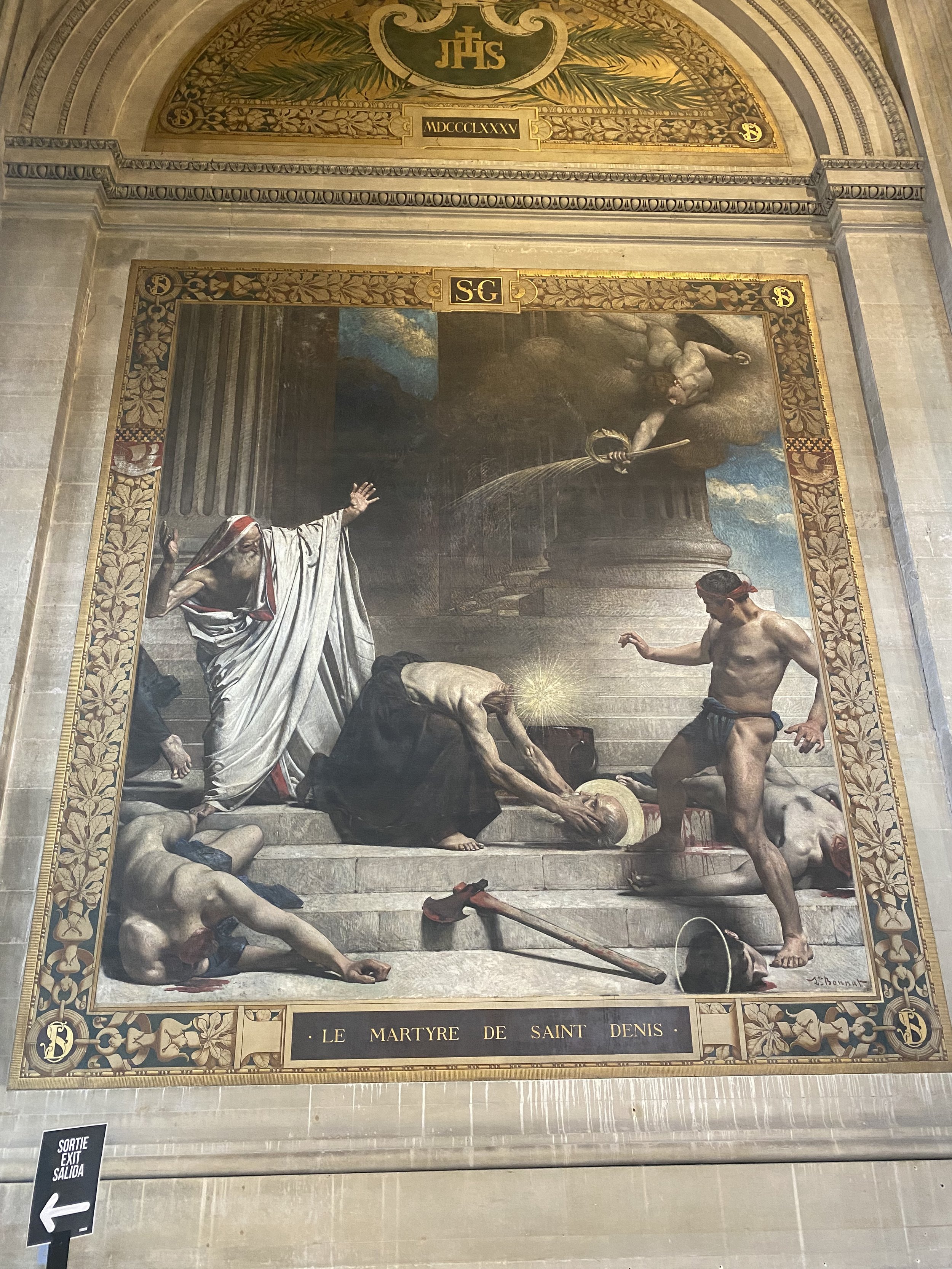 J’ai pris cette photo au Panthéon. Cette scène, peinte dans le dernier quart du 19ème siècle, par Joseph-Florentin-Léon Bonnat, représente la mort du premier évêque de Paris, qui vient d’être décapité sur les marches d’un temple antique, et qui ramasse sa propre tête entre ses deux mains. Le bourreau, pétrifié, en lâche sa hache ! Un ange émerge des nuages pour remettre à saint Denis les symboles du martyre que sont la palme et la couronne de laurier. On compte environ 120 saints céphalophores, c’est-à-dire qu’ils portent leur tête, comme Saint-Mitre, dont on peut voir la statue à la cathédrale Saint-Sauveur à Aix-en-Provence…
