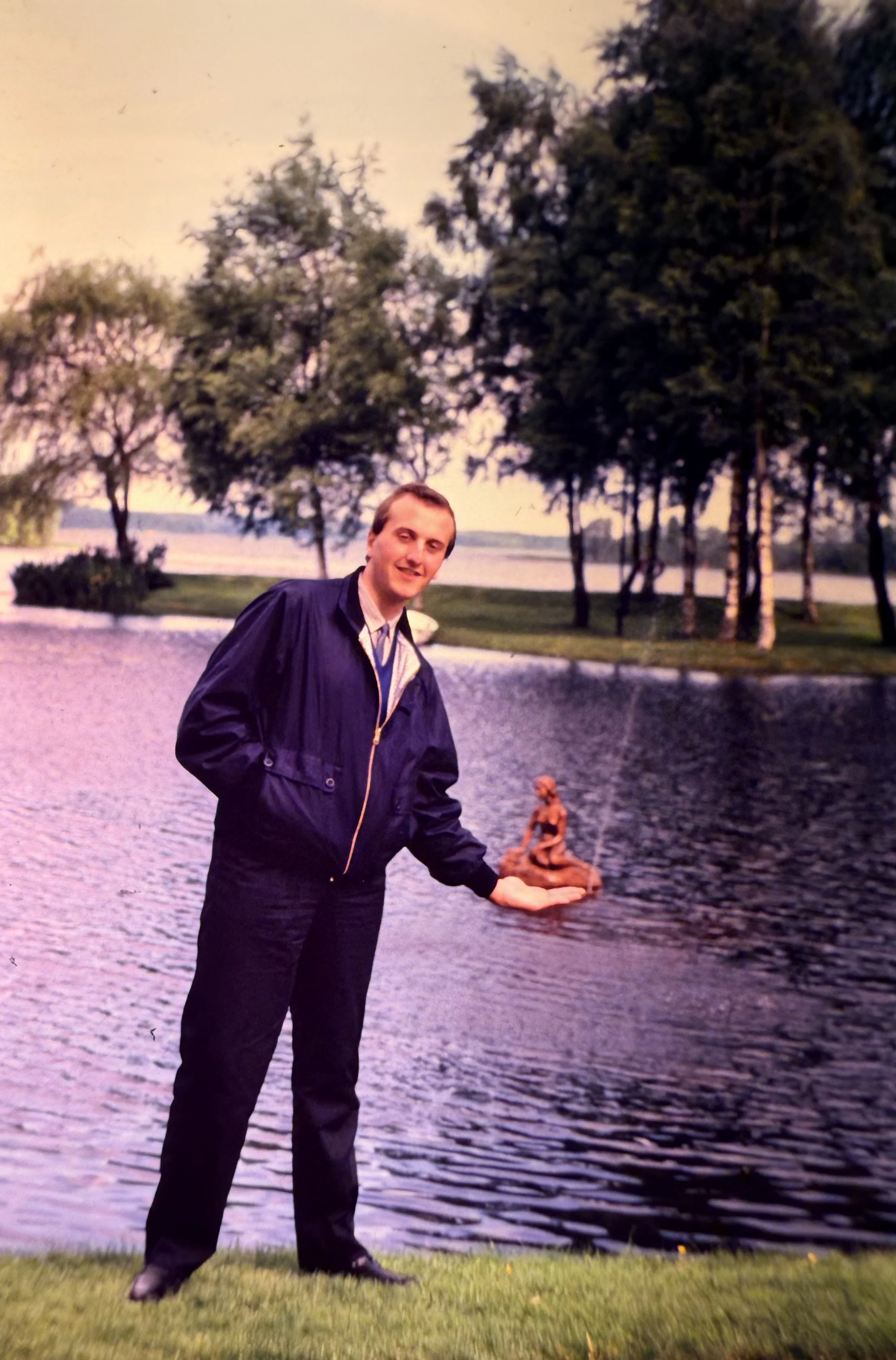 En voyage au Danemark dans les années 1980, devant une réplique en miniature de la Petite Sirène de Copenhague, inspirée du conte d’Andersen…
