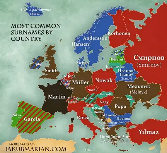 C’est-à-dire “fils de” pour moins du tiers des Suédois : Andersson (le nom le plus répandu en Suède), Johansson etc. Il y a cinq noms de famille très fréquents puisque portés par environ 20 % des Suédois : Andersson, Johansson, Karlsson, Nilsson et Eriksson.